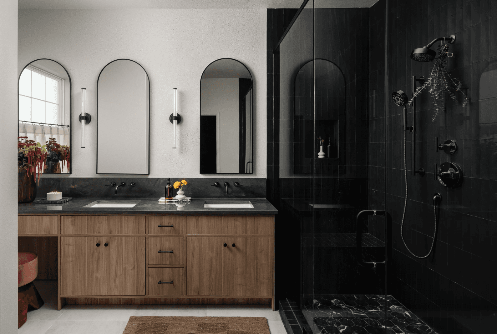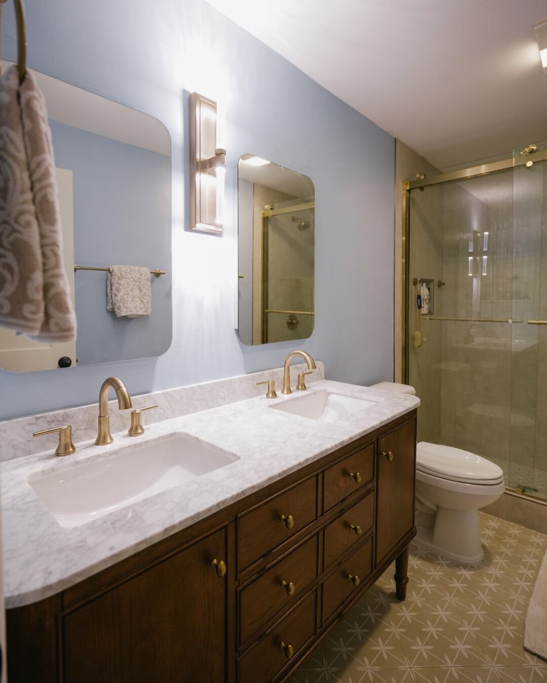 This bathroom features a custom walnut double vanity with Carrara marble and champagne bronze fixtures. The shower includes floor-to-ceiling subway tile, frameless glass, and dual rainfall heads. Geometric floor tile and updated systems complete the space.