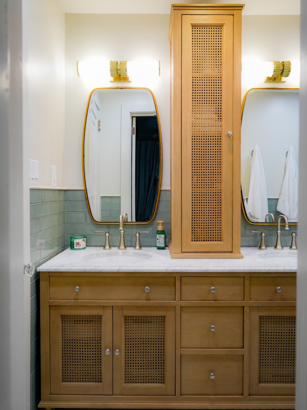 This master bathroom features a walk-in shower with sea glass subway tile, penny mosaic accent, and frameless glass. Champagne bronze fixtures add warmth. Choose between a mid-century oak vanity with cane panels or traditional walnut double-sink—both with marble tops. Upgraded plumbing and ventilation included.