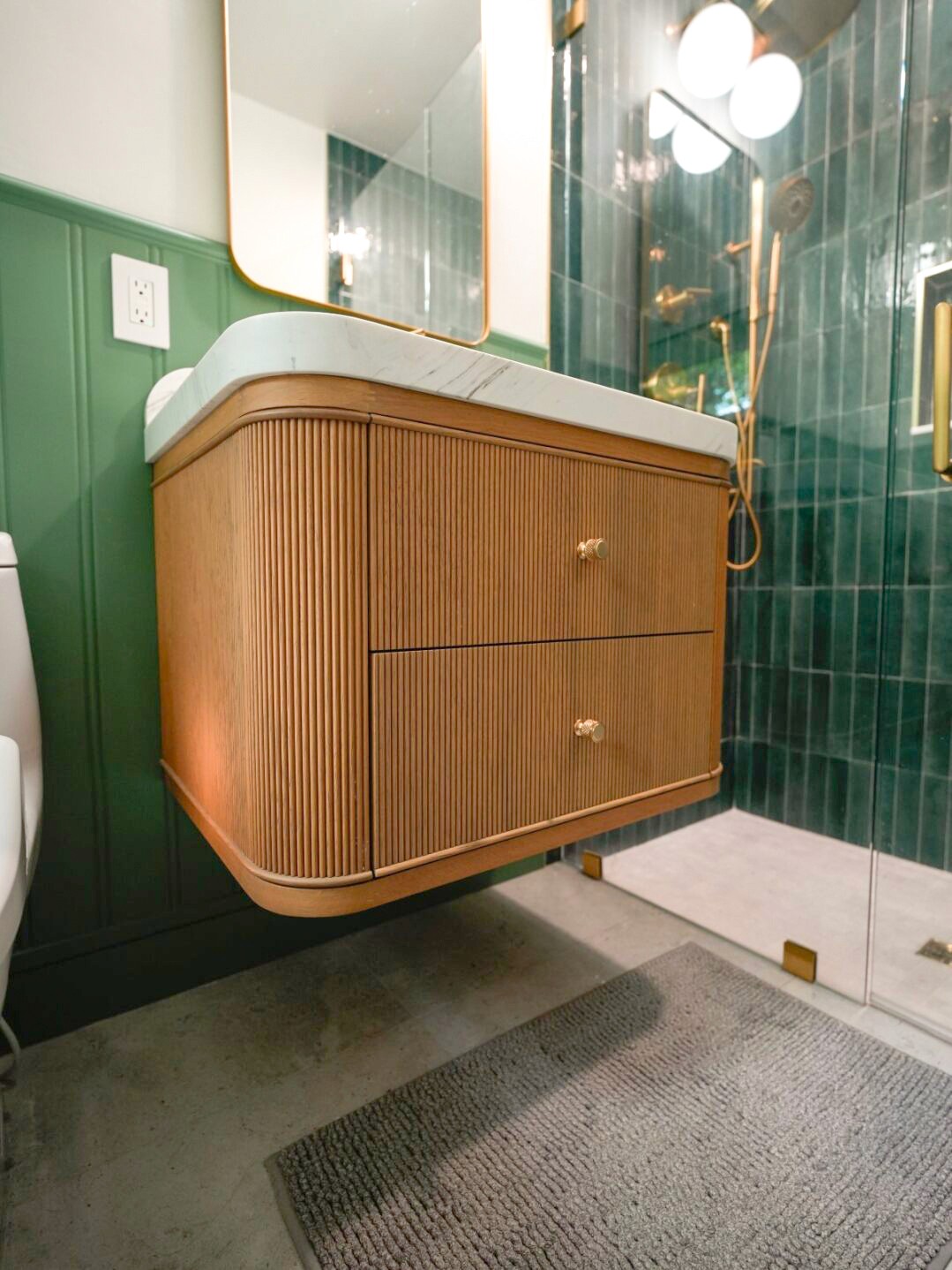 Perfect bathroom! The vanity looks like fine furniture, Carrara marble is gorgeous, and champagne bronze fixtures add warmth. Dual showerheads are a daily luxury. Team handled subfloor issues professionally without drama. Patterned tile and wood-trimmed niches are beautiful and functional. Six weeks, respectful and clean throughout. Timeless elegance!