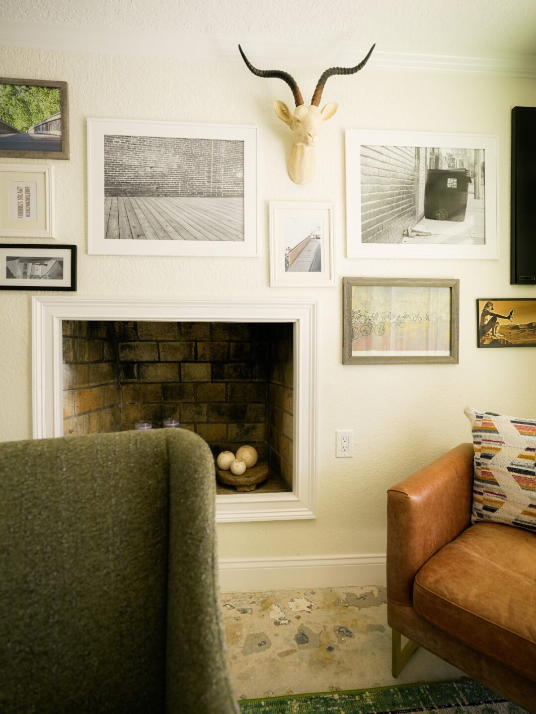 This historic Tampa home renovation balances period charm with modern function. A stunning arched brick alcove was uncovered and restored as a coat hook area. The original fireplace was preserved with fresh white trim and custom mantel. Updates include neutral paint, terrazzo-look flooring, LED lighting, restored arches, new carpet, crown molding, and upgraded electrical—all maintaining historic character.