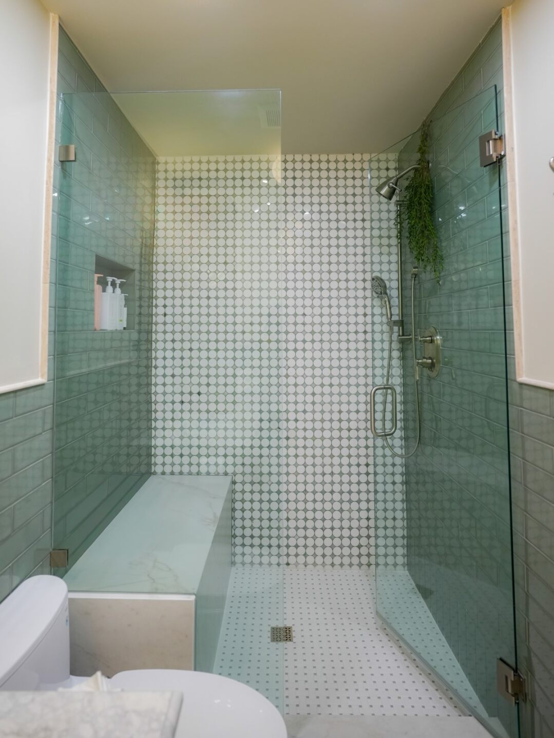 This bathroom exceeded every expectation we had! We wanted something that felt like a luxury spa but was still practical for daily use, and they absolutely nailed it. The sea glass tile in the shower is gorgeous—the color changes beautifully depending on the light. The penny tile accent wall was a suggestion from their designer and we're so glad we went with it. The craftsmanship is impeccable—every tile line is perfectly straight, every corner is precisely mitered. The custom vanity with the cane webbing is a work of art; we get compliments from everyone who sees it. The champagne bronze fixtures were the perfect choice to warm up the cooler tile tones. What impressed us most was how they handled an unexpected plumbing issue behind the walls without any drama or surprise costs—they just fixed it and kept the project moving. The team was professional, respectful of our home, and incredibly talented. Seven weeks later we have a bathroom that feels like we're on vacation every morning!