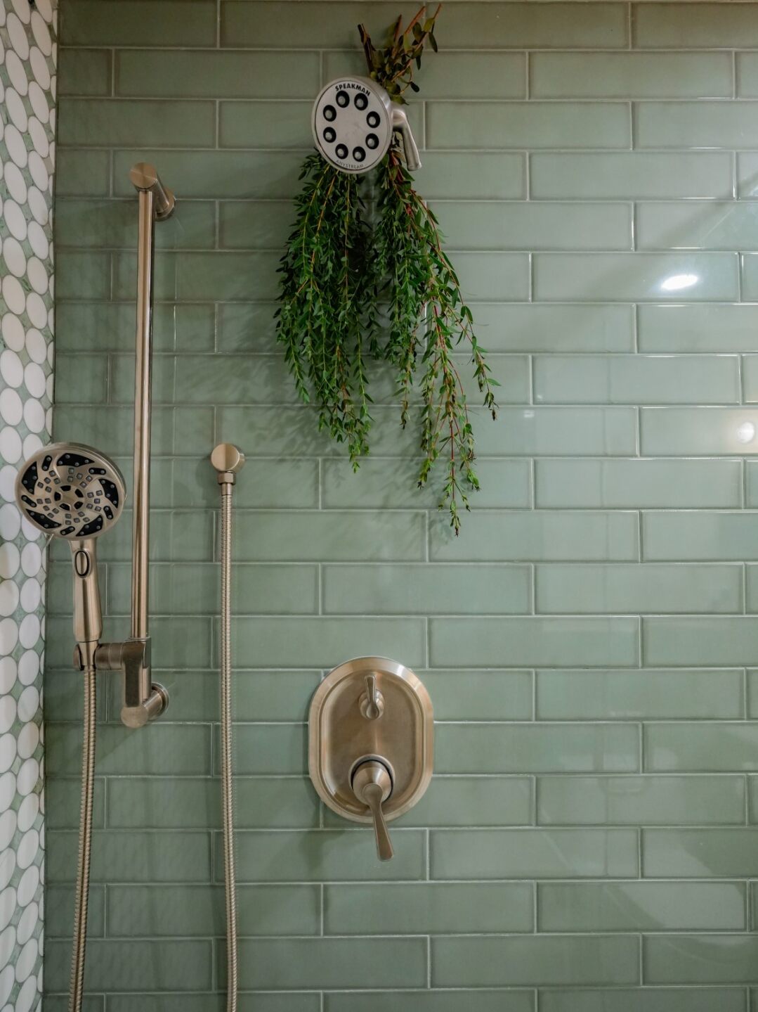 This sophisticated master bathroom transformation creates a serene spa retreat with exceptional attention to detail and custom design elements throughout. The project showcases premium materials, expert tile work, and thoughtful design that balances beauty with functionality. The stunning centerpiece is a spacious walk-in shower featuring beautiful sea glass green subway tile walls, an eye-catching penny round mosaic accent wall in soft sage tones, and classic white hexagonal floor tile. The frameless glass enclosure maximizes the feeling of openness while showcasing the meticulous tile work. Champagne bronze fixtures throughout—including a dual-function handheld and fixed showerhead system—add warm metallic accents that complement the cool tile tones perfectly. Two distinct vanity designs demonstrate versatility and craftsmanship. The first features a custom mid-century modern inspired vanity in natural oak with cane webbing door panels and matching tall storage tower, topped with luxurious white marble countertops and dual undermount sinks. Organic-edge gold mirrors with curved silhouettes and modern sconce lighting complete the elegant look. The second vanity showcases a traditional double-sink design with rich walnut-stained wood, brass hardware, white marble countertops, and soft blue accent walls with frameless rounded mirrors and contemporary linear sconces. Additional features include patterned floor tile in geometric designs, recessed medicine cabinets, moisture-resistant paint with mildew inhibitors, proper ventilation upgrades, and all-new plumbing and electrical systems. Built-in storage niches in the shower provide convenient spaces for toiletries while maintaining clean lines.